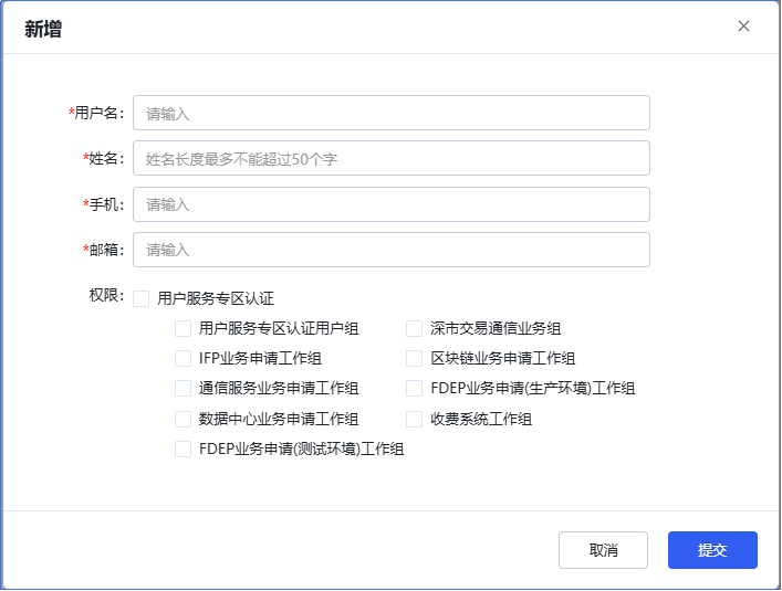 点击“新增”按钮后,将弹出一个窗口,要求填写账号的基本信息,包括用户名、姓名、手机号码以及电子邮箱。